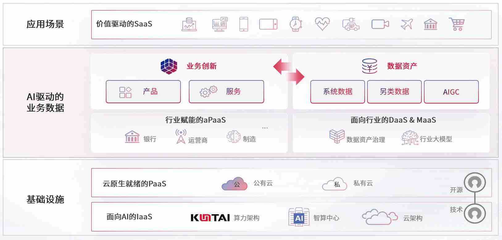 数字时代,,围绕企业数字化转型的关键要素,,,摩域体育数码开创性的提出数云融合战略和技术体系框架,,着力在云原生、、数字原生、、AI原生和信创产业上架构产品和服务能力,,,,为处在不同数字化转型阶段的快消零售、、、汽车、、、、金融、、医疗、、、、政企、、、教育、、、运营商等行业客户提供泛在的敏捷IT能力和融合的数据驱动能力,,,,构建跨界融合创新的数字业务场景和新业务模式,,助力企业级客户建立面向未来的核心能力和竞争优势,,,全面推动社会的数字化、、、智能化转型升级。。